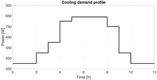 Given the cooling demand shown in Figure 7 and the energy price profile shown in Figure 9, the references of the cooling powers are computed every hour. However, the dynamics related to heat transfer within the TES tank require an internal sampling time of the prediction model of 10 min. The latter could be reduced to increase accuracy, at the expense of greater computational load of the predictive scheduling strategy. Safety limits = 0.05 and = 0.95 have been considered, while a prediction horizon = 4 is set. At the initial state of the TES tank, the intermediate fluid is assumed to be in thermal equilibrium with the PCM cylinders (), whereas the initial enthalpy distribution of the latter is such that = 0.35.