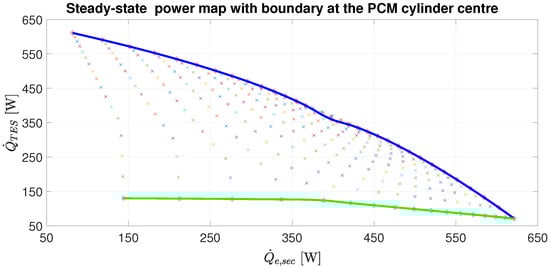 - Layer leaves latent zone. In other words, the latent energy of layer run out some time before the period under study finished, , and then the layer got into sensible zone. The precise instant is estimated, considering a constant rate, , and the remaining latent energy of layer at instant t, as shown in Equation (10) for a charging process or Equation (11) for a discharging process:Then, a shorter time interval, , can be computed as shown in Equation (12):This time interval is used for successive estimation, in which the next inner layer, , is considered as the new first layer in the latent zone, and the algorithm restarts from Step 2, but using the corresponding time period , instead of .Then, the cooling power transferred between each PCM cylinder and the intermediate fluid, eventually has several successive contributions along the original time period , as shown in Equation (13):being the most inner layer found in the latent state during the time period under study . Obviously, the addition of the partial time intervals matches the complete interval, as shown in Equation (14):