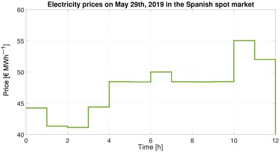 Electricity prices corresponding to 29 May 2019 in the Spanish spot market, once scaled into a 12 h timeframe [31].