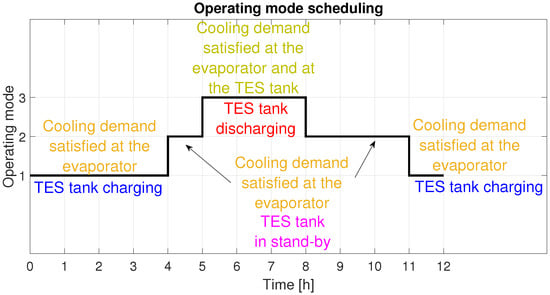 Mode 1 may be scheduled when the cooling demand can be satisfied by using only the refrigeration cycle and it is interesting to simultaneously charge the TES tank. Mode 2 might be scheduled in the same situation, but when the TES tank is fully charged or it is not economically interesting to continue charging it. Mode 3 is useful when the cooling demand is greater than the maximum power achievable by using only the refrigeration cycle. Mode 4 requires that the demand can be satisfied by only discharging the TES tank, thus the refrigeration cycle is stopped.
