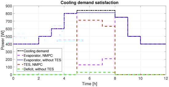 Comparison of the cooling demand satisfaction between the proposed NMPC-based scheduling strategy and the refrigeration cycle without energy storage.