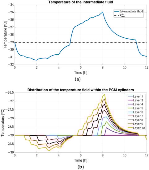 Temperature of the intermediate fluid and the cylindrical layers within the PCM cylinders. (a) Temperature of the TES tank intermediate fluid. (b) Distribution of temperature field within the PCM cylinders.