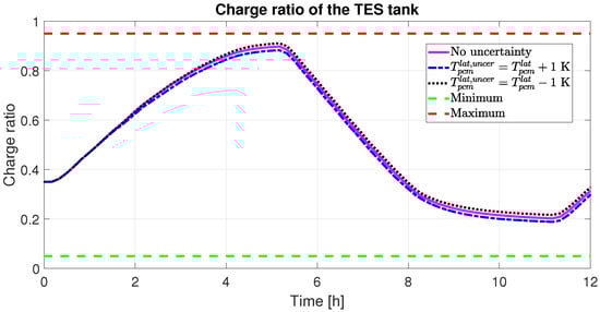 Figure 16 shows the references of the TES charging/discharging cooling powers and , when some uncertainty in is considered. This temperature has been increased/decreased in 1 K from the nominal value in the prediction model. Given the variations of the intermediate temperature for the nominal case shown in Figure 15a, the considered increment/decrement is high enough to cause significant uncertainty in the prediction model with respect to the accurate model used for the plant simulation. Furthermore, Figure 17 compares the TES charge ratio for the three cases.