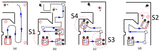 Scenarios for the navigation during pavement sweeping task using cleaning and maintenance vehicles with (a) turning radius, (b) Omnidirectional feature using independent steering action on pavement settings, (c) Constraints at sharp corners by the ICR selection, and (d) obstacle near the turning routine of the robot. S1, S2, S3, and S4 are the scenarios mentioned in Section 1.