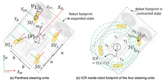 The instantaneous center of rotation (ICR) is the point at which steering units rotate about. The ICR of each respective steering unit is , where is the radius of rotation curve from the ICR to axis of the steering unit in the robot frame . In terms of the robot coordinate frame, ICR for the respective steering unit is as follows Equation (2):