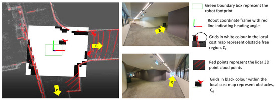 In Figure 5, the black region of the cost map is the obstacle, while the white part is the obstacle-free area. A and B are the regions of corridors The red-colored dotted points represent the point cloud from LIDAR, the green boundary box represents the robot footprint, and the red axis line arrow represents the robot’s heading angle. Surrounding the local cost map is the global 2D cost map. In the local cost map, cost map size and resolution can be tuned. The robot is always in the middle of the local cost map. The robot ICR space is a mathematical space for all discrete values of ICR that Panthera has based on the grid base cost map. It consists of different kinds of regions: the feasible moving region , where there are no obstacles, and non-feasible moving region, , which represents obstacles where