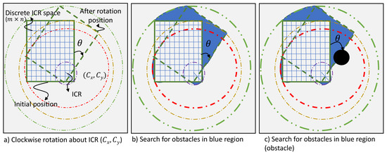 As shown in Panthera’s rotation kinematics, Panthera is capable of performing rotation about an ICR with 4 modes of locomotion. To optimize Panthera’s rotation in a tight environment, there is a need to further reduce the ICR space into a feasible space where the rotation of the robot footprint does not encounter any obstacles. To perform a rotation, the ICR have coordinates where , where and are real values. Furthermore, based on the input angle, , it may or may not collide with surrounding obstacles. After initializing the ICR space and the robot reconfiguration state, b, the algorithm reduces the ICR space by performing checks when the robot footprint is rotated about the ICR by the change in robot heading angle, , as seen in Figure 6a. The blue grids represent the discrete ICR space that is used to perform the trajectory collision check. For a clockwise rotation about the ICR, the robot has to check the cost map in the blue region as seen in Figure 6b by searching all the cells within the blue region for obstacles. If it encounters an obstacle, such as in Figure 6c, the discrete ICR value is removed from the ICR Space. Rotation about ICR trajectory collision check removes all ICR where there is the possibility of collisions. This leaves an ICR Space where there is no possibility of collision.
