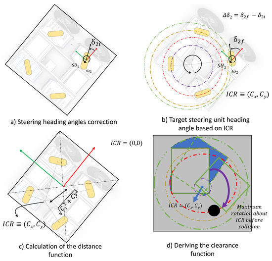 where is the difference between the current steering angle and targeted steering angle based on the ICR as seen in Figure 7a,b. This function minimizes unnecessary rotation of steering units and reduces the power required to make a safe rotation.