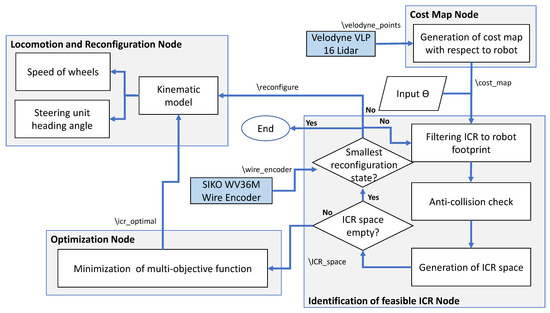 Robotic operating system (ROS) master sets up the connection between multiple computational ROS nodes. A Velodyne VLP 16 lidar is used to generate the local cost map and publish/cost_map topic. The local cost map generated has a grid size of 100 by 100 with a resolution of 0.05 m per grid. The inflation in the cost map is set low as Panthera needs to be close to walls to perform cleaning. It also has stable control with quality sensors to feedback on its position accurately. Based on the cost map and Equation (4), the grid is defined as the ICR space C. The identification of feasible ICR space ROS node subscribes to the /cost_map topic where it removes discrete ICR points outside of the robot footprint, singularity ICR points, and ICR points where collisions are detected. If an empty ICR space is detected, it repeats the identification of feasible ICR space with the smallest reconfiguration state to check if there are possible ICR in their smallest state. If a non-empty ICR space is derived, it performs a reconfiguration to the center of the robot. The identification of feasible ICR node publishes an array of ICR via the topic/ICR_space topic. The optimization node subscribes from the/ICR_space topic. It performs optimization based on predefined weights of the multi-objective function in Equation (6) using the gradient descent method. The optimization node publishes the ICR to the locomotion node for Panthera to perform rotation. A high-level ROS architecture implemented in Panthera can be seen in Figure 8. In all experiments, to reduce computational cost in its implementation, the clearance function checks in a resolution of 5 degrees of rotation clearance per iteration.