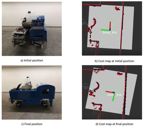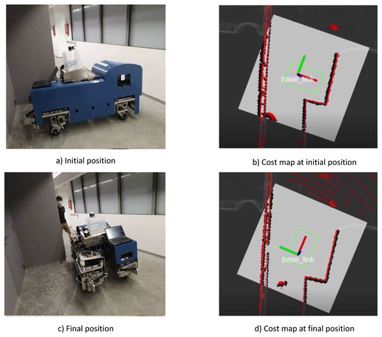This experiment aims to demonstrate Panthera’s collision-free rotation performance when in a wide path. Figure 11 shows the experimental setup and initial position of the experiment. Panthera is along a wide walkway as reflected in the local cost map seen in Figure 11b.