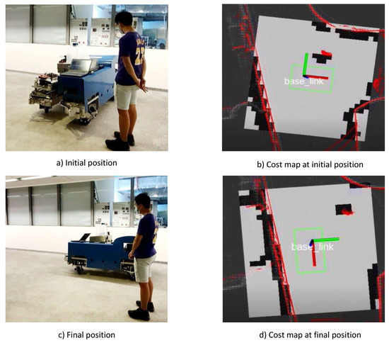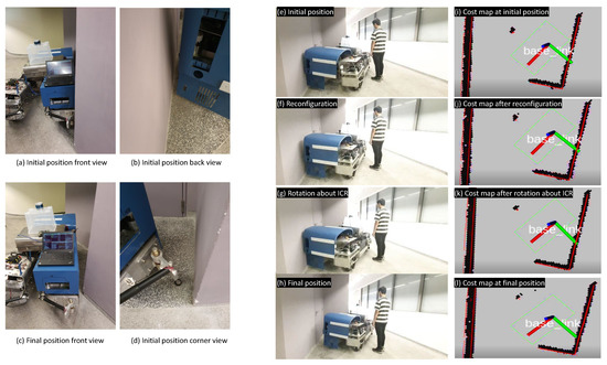 Unable to conduct the rotation is an issue for a fixed shape robot when it is completely surrounded by static and dynamic obstacles. However, using the 4WISD mechanism incorporated with reconfiguration ability while selecting the flexibility ICR within the robot footprint, Panthera is able to navigate out of the “impossible” scenario. Figure 12a,b,d,e shows the experimental set up and its initial position of the experiment to demonstrate the infeasible rotation condition for other fixed shape robots even with the 4WISD kinematics model. Panthera is set in the fully expanded state and is close to two adjacent walls and a pedestrian, making any static rotation impossible at its current reconfiguration state. Figure 12i shows the zoom-in cost map at the start of the experiment. The cost map is zoomed in for better visualization of the robot’s footprint and movements.