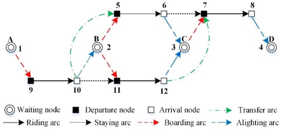 Figure 2 shows a passenger travel network constructed based on four stations and two trains, where each letter represents a station and each number represents a generated node. The first train runs from station B to D and stops at station C, and the second train runs from station A to C and stops at station B. Nodes 1, 2, 3, and 4 are station nodes corresponding to station A, B, C, and D, respectively. Take the first train as an example: its departure nodes at station B and C are nodes 5 and 7, and its arrival nodes at station C and D are nodes 6 and 8, respectively. Its riding arc from station B to C is arc (5,6), its riding arc from station C to D is arc (7,8), and its staying arc at station C is arc (6,7). The alighting and boarding arcs at station C are arc (6,3) and (3,7), respectively. In addition, the transfer arc from the second train to the first train at station B is arc (10,5), and the transfer arc from the first train to the second train at station C is arc (12,7).