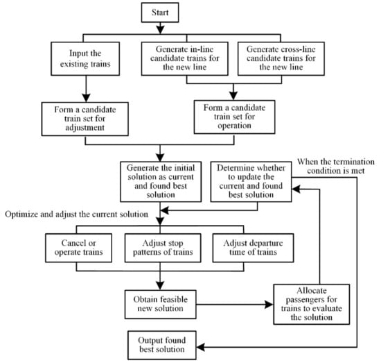 There are a large number of trains running on the HSR network each day, and the combinatorial optimization of their routes and stop patterns is extremely arduous. The corresponding solution space will be enormous and the efficiency of solutions will be poor if the line plan of new HSR lines and the existing HSR network is determined or adjusted directly based on the spatial–temporal distribution of OD demand. In order to improve the efficiency of the solution and ensure the rationality of the line plan obtained, this paper firstly generates a candidate train set (denoted as ) composed of trains which may be adjusted on the existing network and another candidate train set (denoted as ) composed of trains which may be operated on the new railway line. Following this, according to the spatial–temporal distribution of demand, trains are selected from the set for adjustment and from the set for operation, and their stop patterns, departure time, and arrival time at each visiting station are optimized simultaneously.