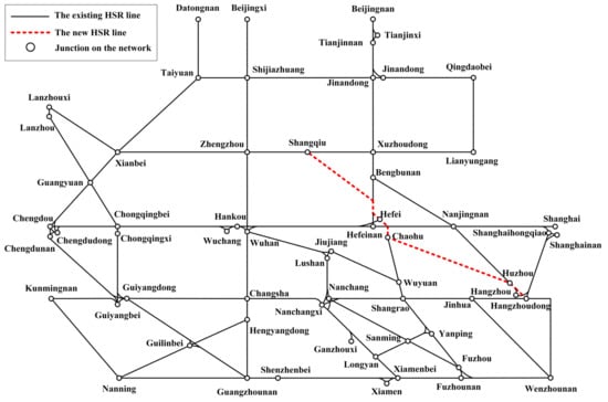 The new HSR network is represented by , which consists of a new HSR line and the existing HSR network. The new HSR line can be denoted as , where is the set of stations and is the set of track sections, and a track section is the joint between two contiguous stations on a railway track. Similarly, the existing HSR network can be denoted as .