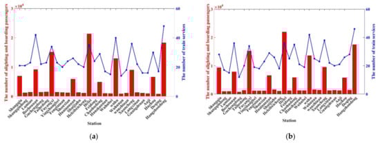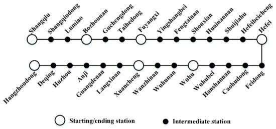 The trains operated on the existing HSR network can be denoted as . The initial station, terminal station, and visiting station set (which includes initial station and terminal station) of any train can be denoted as , , and , respectively. The departure time, arrival time, and whether to stop a train at any station can be denoted as , , and , respectively, where refers to the train stops at the station, otherwise .