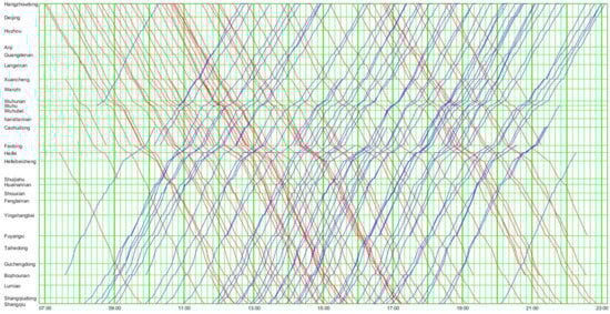 For the purpose of improving the level of railway services, there are also some studies that have been implemented to optimize the line plan from the perspective of passengers’ interests. Bussieck et al. [9] derived a mixed integer linear programming model for the optimization of line plans to determine a set of lines of which frequencies satisfy the line–frequency requirement for every track section under the constraint of the railway budget, aiming to maximize the number of direct passengers. Schöbel et al. [10] and Scholl [11] constructed a change-and-go graph to describe the travel behaviors of passengers choosing the shortest travel route. Under the constraint of the railway budget, an integer optimization model of line planning was established with the goal of minimizing the total travel time and transfer times of passengers. Heuristic algorithm, Dantzig–Wolfe decomposition, and branch-and-bound method were used to solve the problem, respectively. Borndörfer et al. [12] and Borndörfer et al. [13] presented a model in which travelers’ routes could be freely generated with the purpose of minimizing the riding time of all travelers. Two multi-commodity flow formulae were proposed. The first focused on the situation in which all paths served as lines as an integer programming model in which both the passengers’ paths and the routes of the lines were not fixed in advance but determined within the process of optimization. The second set a variable for each potential line and for each potential traveler path, solved by a branch-and-price method. The lines dynamically generated in the second formulation were solved by a column generation approach. Given upper frequency requirements, Puhl et al. [14] introduced a line pool which maximized the number of transported travelers. Klier et al. [15] proposed a model that used frequency-dependent transfer times as input data to maximize the total number of expected passengers.