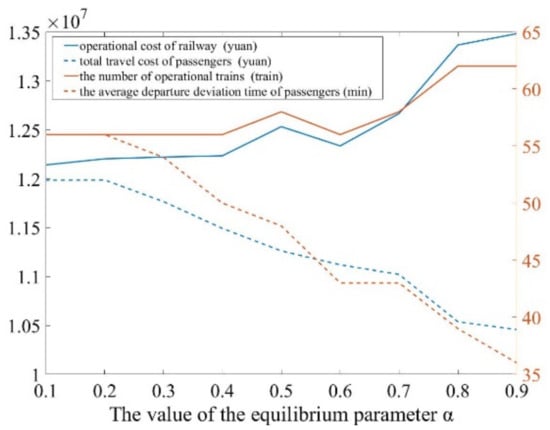 Moreover, there are some studies that apply game theory to line-planning optimization. For example, Schöbel et al. [20] presented a model based on game theory in which lines acted as players and competed to minimize their own delays depending on the volume of demand on each track section and frequencies of line. Using this model, the equilibrium solution of the problem was calculated and analyzed. Kontogiannis et al. [21,22] assumed a potential crowd of line operators with fixed lines that tried to maximize their personal profits, then introduced a network administrator who was in charge of the infrastructure. The target of the network administrator was to achieve a social optimum by maximizing the total profits of the operators. The process by which passengers decide whether to travel or not and choose a transfer plan according to general travel costs based on line plans formulated by railway enterprises that aim to maximize operational revenues under resource constraints was described as a Stackelberg game in Shi et al. [23]. Based on this, a two-layer programming model for line planning was constructed, which combined line planning, transfer network design, and passenger travel route selection. The lower-layer model was based on the line plan generated by the upper layer.