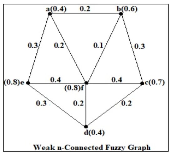 Here, , , , , , . The order of this weak -connected fuzzy graph is 3.7, and the size is 2.6.