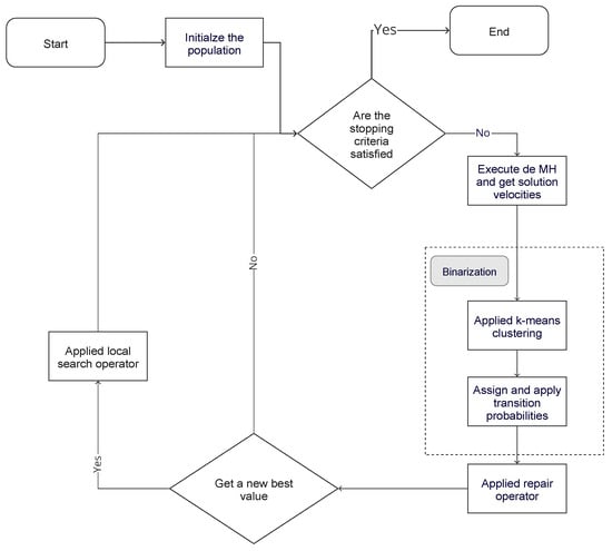 This section aims to detail the proposed algorithm to address the MDMKP. In Figure 1, the flowchart of the algorithm is shown. The first stage is to generate the solutions; this will be detailed in Section 3.1. Once the solutions are generated, it is validated if the termination criteria are met. For this case, the termination criterion corresponds to completing the maximum number of defined iterations. If the criterion is not met, then the metaheuristic (MH) is executed, and the velocities of the solutions are obtained. Subsequently, the velocities are clustered, and each cluster is assigned a transition probability which is used to perform the binarization; this is detailed in Section 3.2. The movements executed by the metaheuristic or the binarization may have the consequence that the constraints are not met; then, a repair operator is designed, which is detailed in Section 3.3. Finally, a local search operator is applied to the new best solutions obtained. This local search operator is based on the same principles as the repair operator.