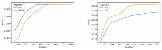 Figure 3. LSO and WLSO Convergence average chart for 100-5-2-0-2 and 100-5-2-1-0 instances.