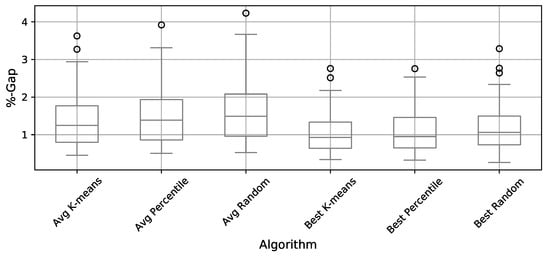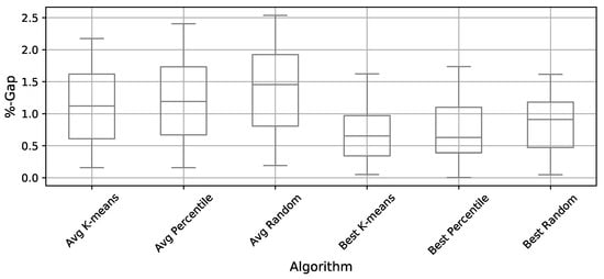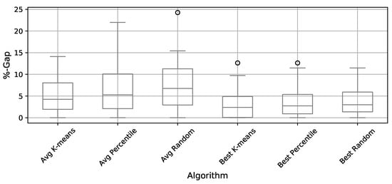 Regarding k-means and random, the first was superior in all instances. By complementing the analysis with the boxplots shown in Figure 6, it is observed that in the case of the k-means averages, it has a lower dispersion than the other two algorithms. The interquartile range and the median also have values closest to zero in both the best and the average. The Wilcoxon test indicates that the difference is significant.