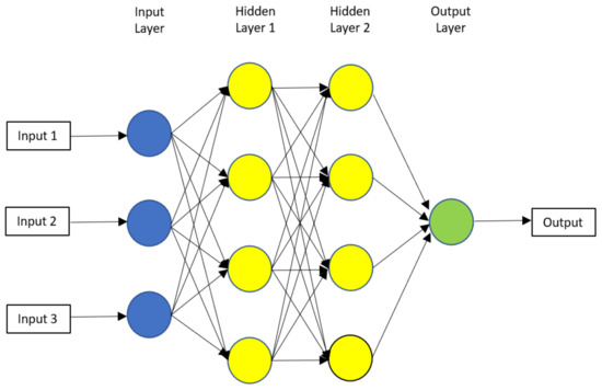 The neural network (NN) model is a type of machine learning model that is capable of modelling complex nonlinear relationships without any prior knowledge of the underlying relationship. For this model, several hidden layers are added between the input layer and the output layer (Figure 1). Each hidden layer contains a set of nodes where each node undergoes a nonlinear transformation of its input before being transferred to the next layer [45].