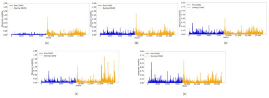 Observed volatility plots for the pre-COVID-19 and COVID-19 periods for (a) Bitcoin, (b) Ethereum, (c) Litecoin, (d) Ripple and (e) Bitcoin Cash.
