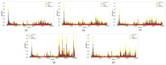 Volatility plots for (a) Bitcoin, (b) Ethereum, (c) Litecoin, (d) Ripple and (e) Bitcoin Cash.