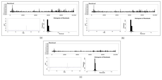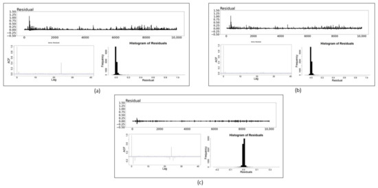Residual plots, ACF plots and histograms of the: (a) GARCH (1,1) model; (b) NN model and (c) SS model for Litecoin. The blue dotted lines in ACF plots indicate the point of statistical significance.