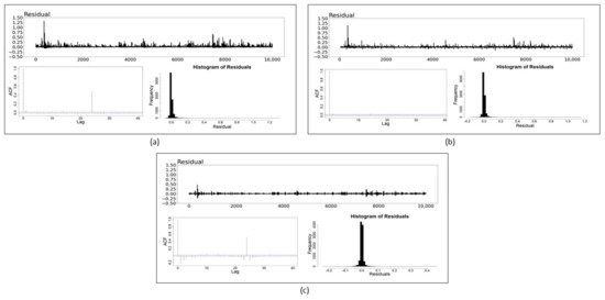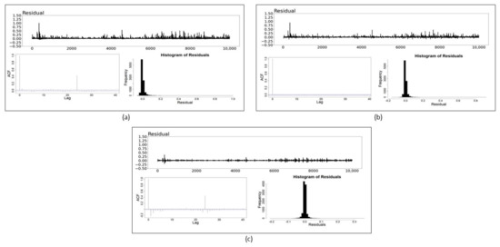 Residual plots, ACF plots and histograms of the: (a) GARCH (1,1) model; (b) NN model and (c) SS model for Bitcoin Cash. The blue dotted lines in ACF plots indicate the point of statistical significance.