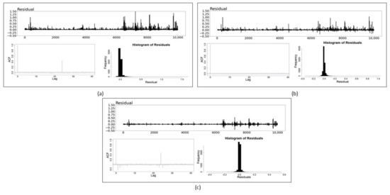 Step 1: The log return of a cryptocurrency is fitted to get the , differences, and coefficients for the best ARIMA model in (6). The parameters () are obtained by using the Hyndman–Khandakar algorithm in [46]. In this algorithm, the number of differences is determined using the repeated Kwiatkowski–Phillips–Schmidt–Shin (KPSS) test [48]. The values of and are then chosen by minimising the Akaike Information Criterion (AIC) after differencing the data times.