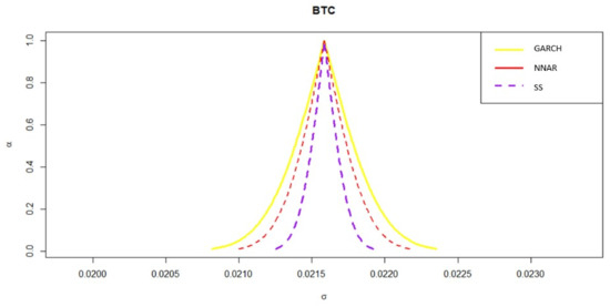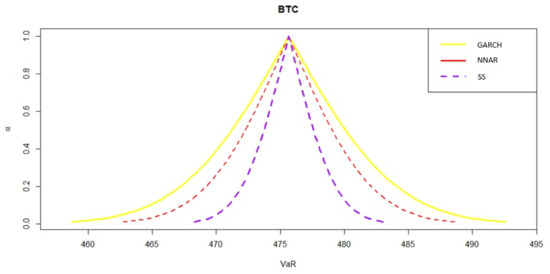The one-step ahead VaR and volatility forecasts for all three models for BTC are also computed along with their confidence intervals with level of significance, as shown in Figure 9 and Figure 10, respectively. The confidence intervals of the VaR and volatility forecasts for all five datasets show similar behaviour (refer to the Supplementary Materials for the confidence interval plots for ETH, LTC, XRP and BCH). It can be clearly seen that the SS model produces the smallest ranges for confidence intervals involving the VaR and volatility forecasts while the GARCH (1,1) model produces the largest ranges. Models that produce VaR and volatility forecasts with smaller variability i.e., confidence interval with smallest range, enable risk managers to make more precise statements about VaR. Therefore, the SS model is recommended for VaR and volatility forecasting.