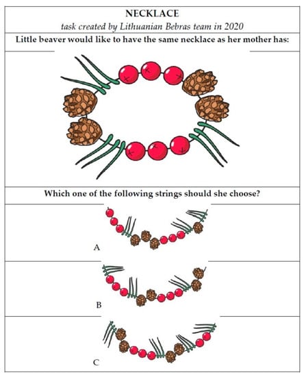Short Bebras task for younger children. Labels A, B, C denote answer choices. Adapted from www.bebras.org (accessed on 24 February 2022).