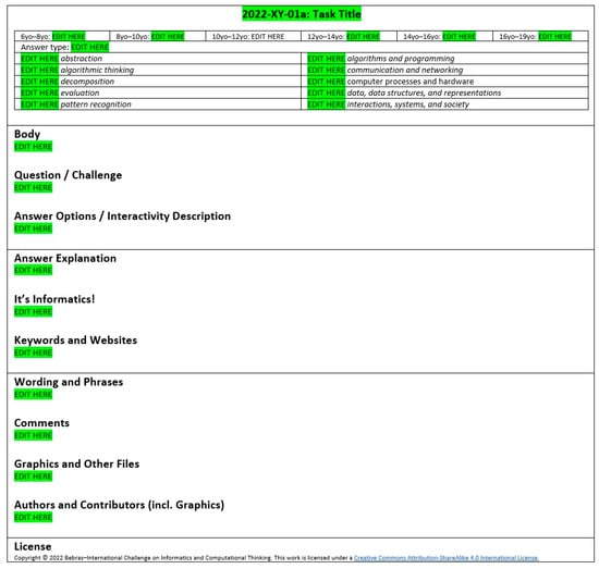 Template for creating a short Bebras task. Retrieved by permission from www.bebras.org (accessed on 24 February 2022).