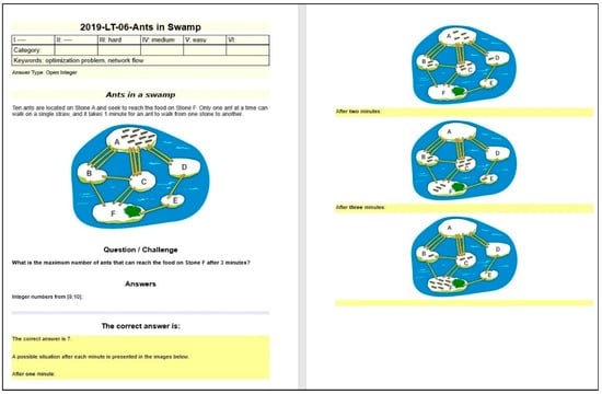 A further important aspect is that the pedagogical design of the problem focuses on formulating it in such a way that it “can be answered without prior knowledge of CS” [69]. This is important because, first, it allows us to attract a broad range of students who do not study informatics at school, and second, it stimulates new ways of reasoning that lead to a deeper conceptual understanding rather than simply memorizing already known facts. To ensure high-quality content, the competition implemented a selection procedure in which assignments are discussed, evaluated, and selected by members of the professional community-experts in pedagogical task design–to meet a number of formal requirements, including attractiveness, creativity, and CT support.