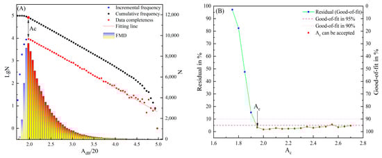 In rock mechanics, the acoustic emission (AE) technique is often used to study the destruction properties of rocks by recording elastic wave information radiated by crack initiation, propagation, and penetration during rock deformation [28,29,30,31]. Additionally, the AE test method is also an important means to simulate earthquake foreshock sequences and study focal mechanisms [14,32,33,34,35,36,37,38,39,40,41,42]. Therefore, the space–time variation characteristics of the b value obtained in rock AE deformation tests have been used to simulate earthquake precursor characteristics [43,44,45,46,47]. However, unlike the magnitude used in Equation (1) for b value estimation in seismology, AE equipment records the high-frequency elastic wave signal of the small-scale rupture, and the AE amplitude is the apparent amplitude measured by sensors at the sample boundary after attenuation from the seismic source [25]. The corresponding apparent amplitude-frequency distribution does not represent the source size distribution. Thus, the frequency-size distribution law of the source signals collected by the sensors in the rock AE test will be changed owing to the elastic wave attenuation, and the same deviation will appear at both ends of the amplitude-frequency as the magnitude-frequency distribution [33,37], which would affect the size of the real b value. (Here, the analogy with the earthquake is used to define the left and right deviation points of the amplitude-frequency distribution of the rock AE test as the completeness amplitude point Ac and auxiliary discontinuous amplitude point A0, respectively.) Although some researchers have long been concerned about the influence of attenuation on the amplitude-frequency distribution in rock AE tests and have also proposed some corresponding compensation methods to obtain the equivalent AE magnitude with the same significance as the magnitude of the earthquake to analyze rock b value characteristics [44,48], the equivalent amplitude distribution still cannot fully represent the real frequency-size distribution of rock cracks. To solve this problem, Liu [25] used a statistical method to prove that the apparent amplitude-frequency distribution retains the source frequency-size distribution characteristics, wherein the key to estimating the real b value is to properly truncate the apparent amplitude-frequency distribution. A new b value estimation method called the Fisher optimal split and global search algorithm (FGS) was proposed to identify the log-linear segment from the apparent amplitude-frequency distribution of the rock AE test for b value estimation. In addition, because AE acquisition equipment is very sensitive to the interference of test conditions, such as environmental noise and current signals, a high threshold value of the signal acquisition is generally set for laboratory rock AE tests. Thus, the completeness amplitude Ac is usually ignored. Therefore, the completeness of the amplitude data should also be considered when considering how to obtain the source size distribution characteristic parameters using the apparent amplitude-frequency distribution in the estimation of the rock AE b value.