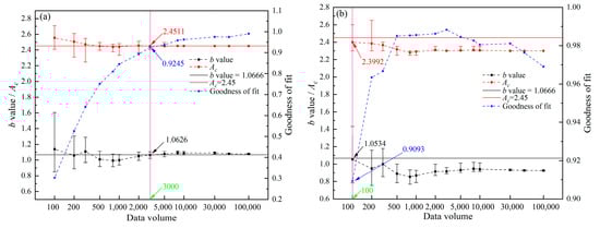 As shown in Figure 3, the accuracy of Ac estimated by the five methods was positively correlated with the accuracy of the b value, which indicates that selecting an appropriate Ac is very important for the correct b value estimation. This also proves the availability of generated synthetic data to simulate real AE data to a certain degree. It can be seen from the stability of the estimation results that the goodness-of-fit of all methods exceeded 0.9 when the data volume was 3000. Because GFT-90% uses the cumulative amplitude-frequency distribution to estimate Ac, the goodness-of-fit can reach 0.9 just for a data volume of 100. An interesting phenomenon is that the accuracy of the Ac and b values decreased with an increase in the data volume, and only when the data volume was greater than 300, the results of 1000 Bootstrap samples could be successfully searched. MBASS is more dependent on the amount of data and requires at least 5000 data volumes to successfully search the results of 1000 Bootstrap samples. Therefore, these two methods are not suitable for estimating the Ac and b values. The confidence limits and uncertainty of MAXC and MBS were consistent when the data volume was less than 3000. However, when the data volume was greater than 3000, the confidence limits of the MAXC and FGS methods began to gradually decrease to 0, while the mean Ac and b value estimation of MBS exceeded the theoretical value, and the uncertainty of Ac was evident. In addition, because both Ac and b are statistical values, the stability of the statistical results largely depends on the amount of data. To better search the log-linear segment, the doubly truncated amplitude-frequency distribution was accepted by FGS, which fully considers the amplitude distribution characteristics. Therefore, the uncertainty of the Bootstrap confidence limit was higher than that of other methods when the data volume was small. However, it can also be seen that the mean Ac and b values of the Bootstrap samples obtained by FGS were still accurate.