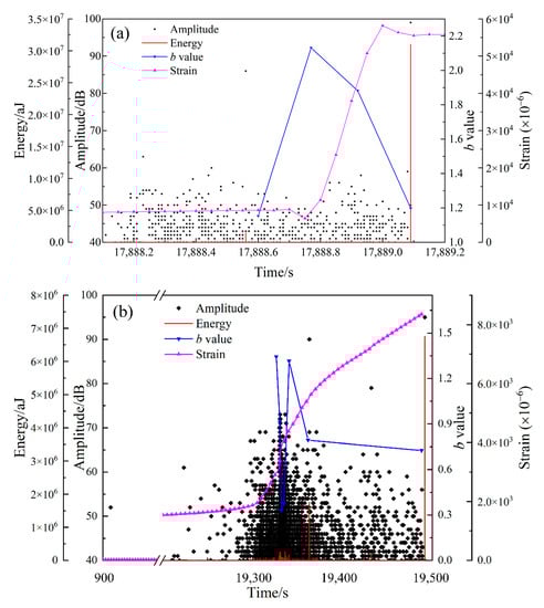 The temporal variation characteristics of the b value are often used for seismic hazard analysis, crack scale failure description, and damage accumulation assessment in rock; normally, the b value is negatively correlated with the stress. As shown in Figure 9, we used the new b value estimation procedure recommended in Section 2.3 to estimate the AE b value with temporal variation and combined energy, amplitude, and strain to further verify the effectiveness of the MFBG through the internal relationship between the b value and crack scale development during rock failure. Because the b value is a statistical value, the accuracy of its estimation results is greatly affected by the data volume. Therefore, in order to improve the representativeness and the readability of the analysis results, here we only conduct a special analysis on the granite with the largest data volume collected. Figure 9c shows that the rock failure under expansion stress was manifested as a continuous increase in deformation macroscopically, which has experienced the entire process of compaction of existing defects and microcracks, initiation, propagation, and interpenetration of new cracks, and finally, the formation of the main fracture [59,60]. In this process, the appearance of energy and amplitude signals was usually triggered by a rupturing scale, which in turn led to a decrease or increase in the b value under the constraints of statistical laws. Furthermore, Figure 9 shows that the temporal variation characteristics of b values decreased continuously, and especially for the time before 16,550 s and after 16,600 s that b value almost linearly decreased. This is consistent with Scholz’s laboratory experiments [14], which also show that the b value in the size distribution of AE events decreases linearly with differential stress. Therefore, the MFBG method estimated the b value in the AE tests can accurately describe the size distribution characteristic of rock failure.