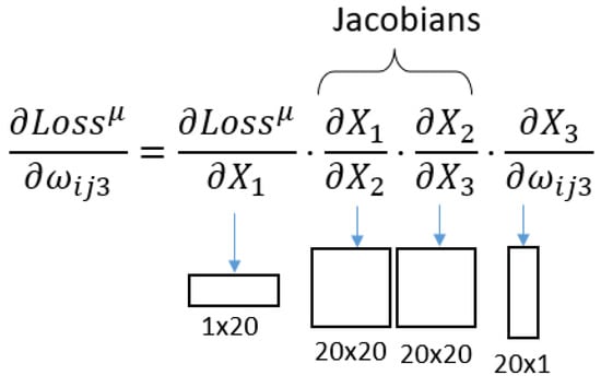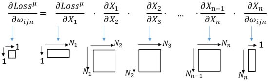 In this way, the Jacobians to be analysed are defined generically. A study can, therefore, be developed concerning the size of each component of the previous equation, as represented in Figure 2; as it is known that the equation is made up of vectors and matrices, Nn marks the number of output connections the n layer has.