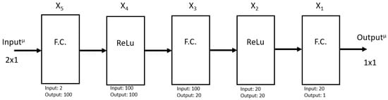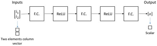 In the particular case of this study, a neural network with the structure of Figure 3 is analysed. It can be noted that there are two inputs in the form of a column vector and a unique output, which is a scalar. The network is composed of three fully connected layers, annotated as FC and two ReLU activation functions.
