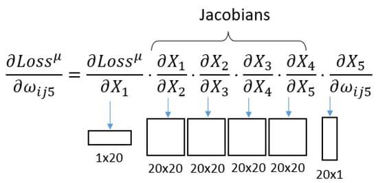 - Finally, the study starting from the output layer is the simplest, since there are no Jacobian matrices, as shown in Equation (9).