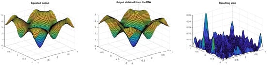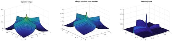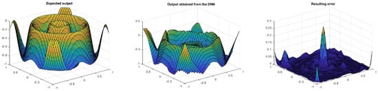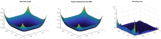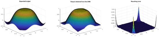 where x and y are the inputs of the network and z its output. Figure 30 shows the expected output, the obtained results and the error.