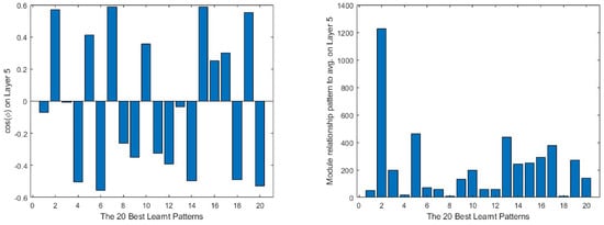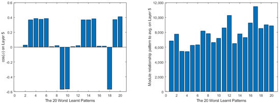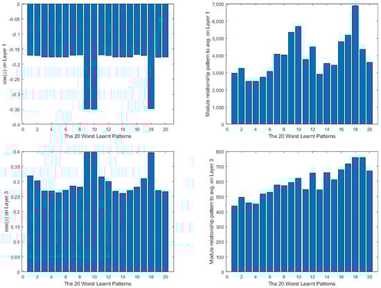 For a more generic view, in Figure 9, taking the 20 worst learnt patterns and looking at their cos(φ) and module relations, it can be seen that the output layer always shows the opposite direction to the average one in all the cases, while in the intermediate layer, it is always partially aligned with it, as the values of the cosine are below the 0.4 value. This means that much of the information concerning the pattern is not being learnt by the layer. The input layer is the one that presents the most random situation, where some of the patterns present a value close to 0 in the cosine and, for the rest, none of them reach a value near 1. Turning to the comparison of the modules, the patterns require a much bigger correction in all the layers than the average produces, the minimum values being over 400 times bigger than the average module.
