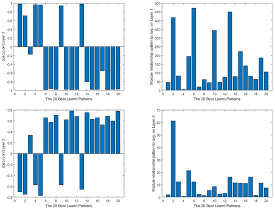 On the other hand, in Figure 10, the same data from the best learnt patterns is shown. As a general view, the absolute value of the cosine is nearer to 1 than in the case of the worst learnt ones. Furthermore, the difference between the modules is much lower in most of the cases. As in the previous group, the input layer presents the less efficient learning parameters.