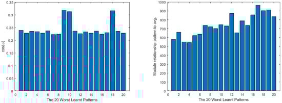 20 worst learnt unified patterns cos(φ) on the left and the relationship to the average on the right.