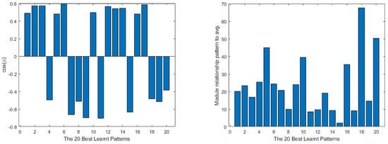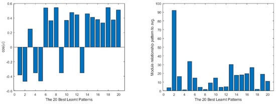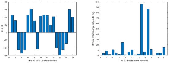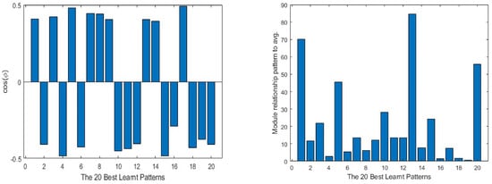 20 best learnt unified patterns cos(φ) on the left and the relationship to the average on the right.
