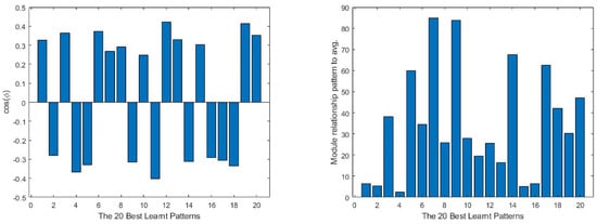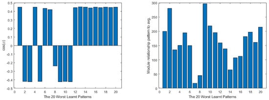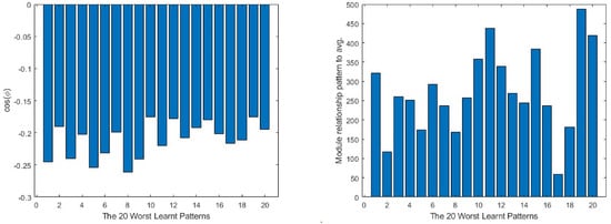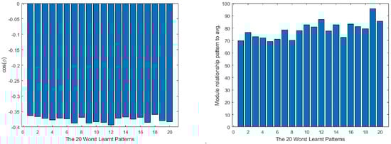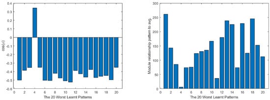 Finally, combining the vectors of these three layers in a single vector, by sequencing them one after the other in a single row vector to analyse the viability of each of the patterns for the current network, it is clear that there are quite big differences between the worst and best learnt patterns. In Figure 11 and Figure 12, the differences in behaviour can be found between these two groups of patterns. The worst learnt patterns are all in the same direction as the average vector, but the cos(φ) value is below 0.4 in all cases, revealing a loss of information in the training process. This can also be seen in the module comparison between the pattern and the average vector, where all the values are over 500; this means that the network needs to change greatly to be able to learn them. On the other hand, the best learnt patterns have a greater variety of direction in the learning process, but it can be considered more closely aligned, as the cos(φ) absolute value is over 0.5 in most cases. On the module side, as they are more easily learnt, the relationship between the modules is less than 50, except in one of the patterns, the second best learnt, which can be classified as a ‘bully’, as it shows a negative cos(φ). What is more, having a high module comparison, this pattern requires the elimination of a large amount of information from other patterns in order to be learnt.