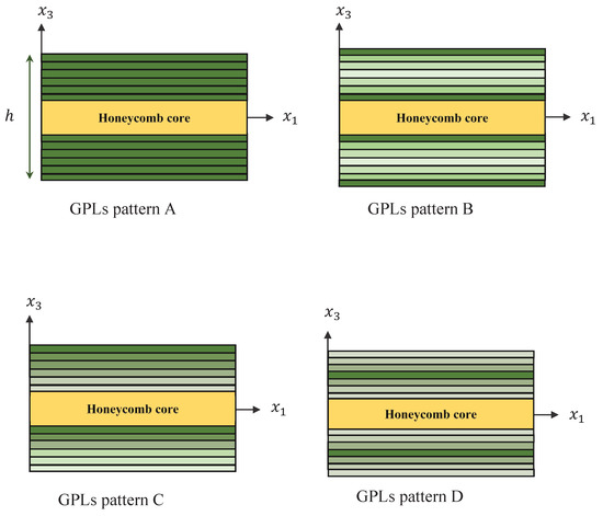 where , , , , , and are Poisson’s ratio, the mass density, piezoelectric, piezomagnetic, dielectric, magnetoelectric and magnetic constants of the GPLs (piezoelectromagnetic), respectively. In the face layers, the volume fraction of the graphene is graded from a sheet to another sheet according to a modified piece-wise rule. Accordingly, four different patterns are considered in the current analysis (see Figure 2). They are provided as follows:
