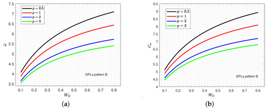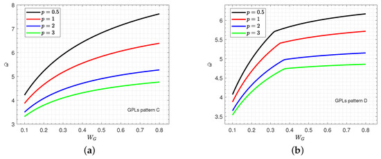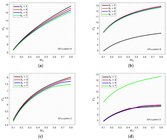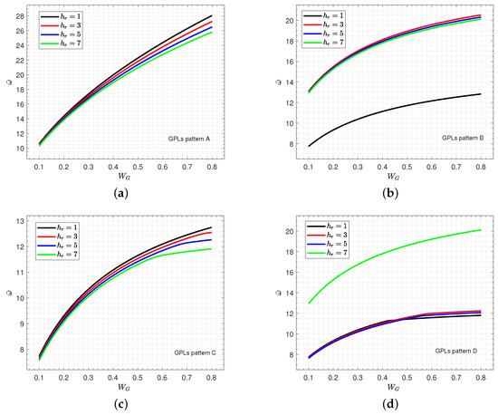 Figure 6 shows the variation of wave frequency of various patterns of the FG GPLs-reinforced sandwich nanocomposite piezoelectromagnetic plate with a honeycomb core versus the graphene weight fraction for various values of the power law index p. Furthermore, in patterns C and D, the effect of the power law index p on the wave frequency occurs obviously for larger values of the graphene weight fraction . This means that the increase in enhances the stiffness of the plate.