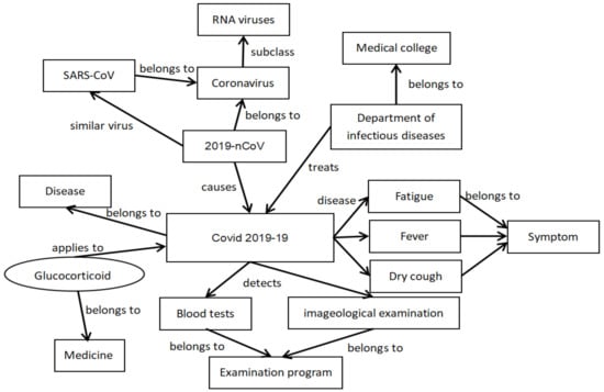 As the kernel technique of Semantic Web (SW) [1], ontology plays an increasingly key role in such domains as information integration [2], data warehouse [3], e-commerce [4] and knowledge acquisition [5]. According to Bekelman et al. [6], an ontology usually contains the following elements: class or conception: describes the objects collection that are common in a specific province from an abstract perspective. For example, “book” can be represented as a class of all book objects in a bookstore; property or relation: explains the relationships of two entities in a particular province; individual or instance: describes the specific objects that correspond to concepts in the real world; function: the descriptions on a specialized relationship, which links the class to its parent class or an instance; axiom: the descriptions on the theorem that are always true in a particular domain. Figure 1 shows an example of a medical ontology of COVID-19, where the rectangle represents class, one-way arrow between the rectangles denotes the relationship or property, e.g., “coronaviruses” is a subclass of RNA viruses. The instance is represented with circular ova, e.g., “glucocorticoids” is an instance of the medicine.